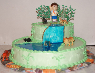 Estos bizcocho lo hice durante la navidad para diferentes ocaciones. Los bizcochos son de los personajes de Campanita o Tinco Bell, Princesa, y Diego (las figuras las compré hecha). La historía que le hice a Diego es en la selva con los animales que avitan en ella. Me inmaginé a Diego valiente cruzando la selva; por medio de una cascada de un rio tratando de llegar a su destino.