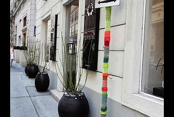 Algunas señales y farolas decoradas con lana en el centro de Viena: