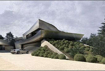 El diseño de esta vivienda contempla diferentes formas orgánicas que convergen en un conjunto escultural. Los diferentes volúmenes se integran en el entorno gracias a la alternancia de materiales en la fachada, como la piedra natural que vemos en esta cubierta ajardinada.