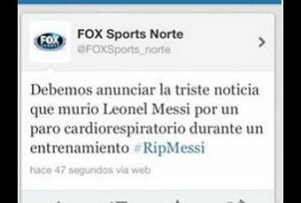 Que un Twitter anuncie en forma falsa la muerte de algún personaje famoso no es nuevo. Pero, que lo haga un medio de comunicación de alta credibilidad es extraño Pasa que los fanáticos de Lionel Messi quedaron impactados por algunos instantes cuando leyeron un mensaje nada alentador. Mediante su cuenta en Twitter el canal de TV Fox Sports (Cono norte), señaló: “Debemos anunciar la triste noticia que murió Lionel Messi por un paro cardiorespiratorio durante un entrenamiento #RipMessi”, decía el mensaje.El mensaje fue borrado casi al instante, pero la noticia corrió como un reguero de pólvora./www.biobiochile.cl/Revista Deportes