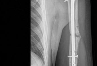 – EN EL PRESENTE ESTUDIO RADIOGRAFICO, CON FRACTURA A NIVEL DE DIÁFISIS HUMERAL, REPARADA CON CLAVO INTRAMEDULAR, FIJADO POR DOS TORNILLOS PROXIMALES Y DOS DISTALES, SIN DESPLAZAMIENTO Y ESCASOS PUENTES ÓSEOS, CON ESCASO EDEMA DE TEJIDOS BLANDOS PERIFÉRICOS.