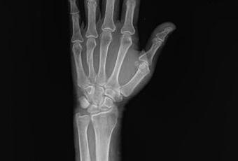 -A nivel del 4to metacarpiano, con pérdida de la contigüidad a nivel de diáfisis por trazo oblicuo, sutilmente desplazado. Resto de huesos del carpo, metacarpos y falanges, sin evidencia de lesiones líticas, blásticas o perdida de la contigüidad.