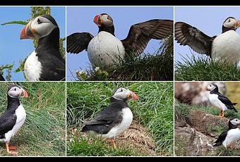 En tierra firme, el Frailecillo Atlántico (Fratercula arctica) deja ver un repertorio de comportamientos y rasgos que pasan desapercibidos en mar abierto. Estas imágenes, tomadas en pleno verano, ofrecen una ventana a la vida de la especie en sus zonas de cría: plataformas herbosas y laderas cerca del mar.