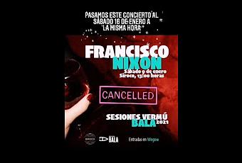 El esperado show de Francisco Nixon en la Sala Siroco se aplaza, debido al temporal, a la semana que viene. Dentro de la nueva programación de Siroco, el show de Francisco Nixon en la Sala en formato vermú se presenta, debido al temporal, el 16/1.Se esperaba como uno de los conciertos de la temporada. El show de Francisco Nixon previsto para el 9/1 se presenta, en este caso para el 16/1. Este show mantiene las entradas vendidas y el horario, por lo que el 16/1 encontraremos en horario matinal un show único con un artista distinto y con todo lo que una de las figuras del pop de altura puede mostrar,