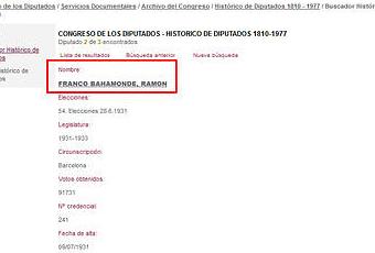Ahí aparece, en el 'Histórico de Diputados' del Congreso, Ramón Franco Bahamonde. Con los siguientes datos: elegido en las elecciones del 28 de junio de 1931 por la circunscripción de Barcelona. Votos obtenidos: 91.731 'Fracción política: Izquierda Republicana de Cataluña'.