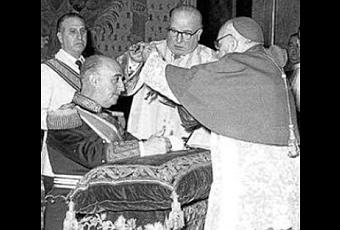 el Collar de la Suprema Orden Ecuestre de la Milicia de Nuestro Señor Jesucristoen la capilla de palacio de Oriente. Distinción Concedida por el papa Pío XII.Franco, ante el altar, y de rodillas, pronunció las siguientes palabras: