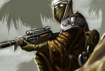 La de Cadía es de un informe de batalla de Combate Urbano(Campaña de Vogen).La he sacado de este blog.Y luego tenemos el caso de la figura de Tallarn,que tiene porque no decirlo,su gracia.Hacia el año 1994, en plena 2ª edición de W40K,alguien en el Studio,seguramente unos de los gemelos Perry,le dio por hacer una figura de francotirador de Tallarn,pero poniéndole a la figura no un rifle de francotirador o un rifle láser modificado con un cañón mas largo,bocacha especial y una mira telescópica.No...le puso un rifle Exitus de los asesinos del templo de los Vindicare!Y así salió esta figura: