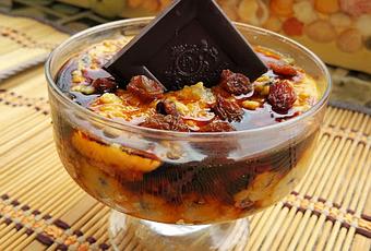 - Retiramos el cazo del fuego, quitamos la rama de canela, piel de limón y las estrellas de anís. Agregamos las almendras trituradas y las pasas, removemos bien y rellenamos los recipientes dónde vayamos a servir el postre. Lo dejamos enfriar un poco y vertemos un poco de miel de palma encima, decoramos con pasas y chocolate. Conservamos en la nevera antes de servir.