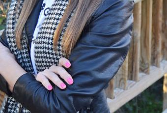 Para hoy, he elegido un outfit muy casual: leggings negros de tiro alto conjuntados con una camiseta crop top blanca de Topshop Londres. Y para el frío mi chupa de cuero negro y mi nueva maxi bufanda de Zara en pata de gallo.