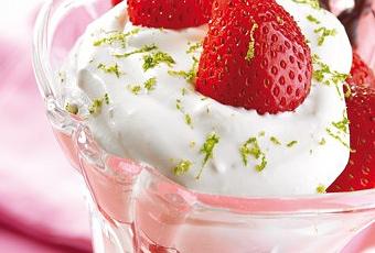 4. Sirve la mezcla de queso y crema sobre las fresas, decora con la ralladura de limón y palitos de chocolate.