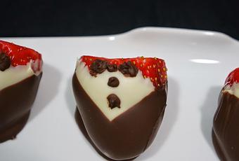 En primer lugar lave las fresas y séquelas muy bien para quitarles el exceso de humedad. Ponga a calentar agua en un cazo y cuando este el agua hirviendo derrita el chocolate blanco al baño maría con ayuda de un recipiente para evitar que se moje. Cuando el chocolate blanco este fundido, corte el tallo de las fresas, sumérjalas en el chocolate y déjelas secar colocándolas boca abajo. A continuación funda el chocolate negro también al baño maría. Cuando el chocolate negro este fundido, vuelva a sumergir las fresas en el chocolate pero en esta ocasión en un angulo de 45º por ambos lados para darle la forma de la chaqueta y coloque las fresas sobre papel vegetal o un mantel de silicona. Con el chocolate negro sobrante y la ayuda de un palillo o un pincel fino, dibuje los botones y la pajarita a las fresas. Introduzca las fresas en el frigorífico durante 30 minutos para que se solidifique del todo el chocolate y ya tendrá listas las fresas para comer.