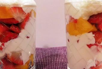 Para montar nuestos vasos, ponemos una capa de fruta y otra capa de nata, asi seguimos haciendo hasta que tengamos los vamos llenos y los adornamos con un trozo de fresa encima.
