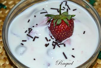 Un yogur de litro natural azucarado con azúcar de cañaMedio kilo de fresasFideos de chocolate (opcional)Preparación:Lavamos muy bien las fresas.Preparamos un bol para ponerlas y las partimos a trozos, yo por la mitad porque son de las pequeñas.Echamos en el bol el yogur y mezclamos.