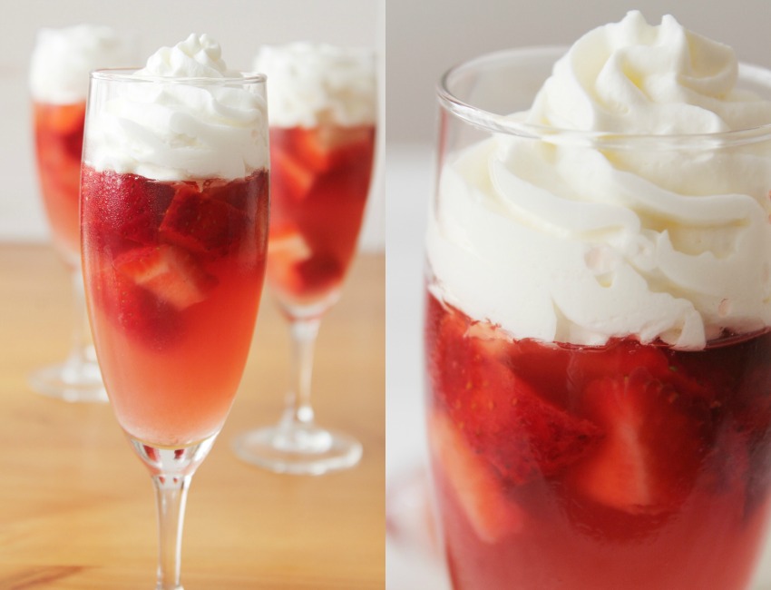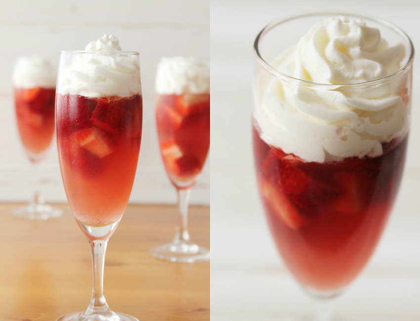 Repartimos las fresas cortadas en las copas de cava y vertemos la mezcla de vino rosado con gelatina hasta el límite de las fresas. Yo rellene demasiado las copas con el vino rosado y era demasiada gelatina para poca fresa. Así que mejor llenarlo solo hasta donde acaban las fresas. Reservamos las copas en la nevera hasta que cuaje la gelatina.