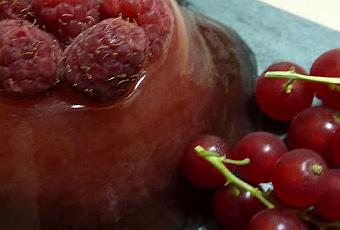 Tritura las frambuesas y pasa por el pasapurés. Pon las hojas de gelatina en remojo. Pon un cazo al fuego con el agua y el azúcar, cuando arranque a hervir añade el puré de frambuesa y las hojas de gelatina hidratadas. Mantén al fuego durante 5 minutos. Aparta y reparte en los moldes. Deja enfriar en la nevera unas tres horitas y sirve con unas frambuesas y unas grosellas. Bon profit!