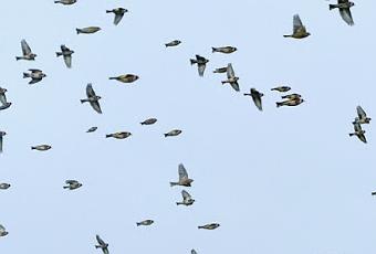 Otro ejemplo muy claro de fringílido invernante en grupo es el del jilguero lúgano Spinus spinus, aunque en este caso todos los invernantes tienen un origen europeo. A partir de mediados de otoño y durante buena parte del invierno se pueden ver los grupos de este paseriforme recorriendo los bosques de ribera, alimentándose de su comida favorita, las semillas de aliso.