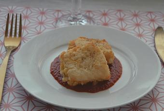 Ingredientes- 750 gramos de bacalao desalado.- 50 gramos de harina.- 2 huevos - Aceite de oliva - Pimienta recién molida.- Salsa de tomate casera.