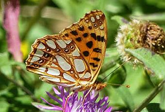 La segunda especie la detecté sólo unos días más tarde, pero en el mismo lugar, uno de mis sitios de prospección favoritos en la localidad de Bocines. Se trata de la mariposa nacarada Argynis paphia, en la que el tono de su reverso hace realmente honor a su nombre.