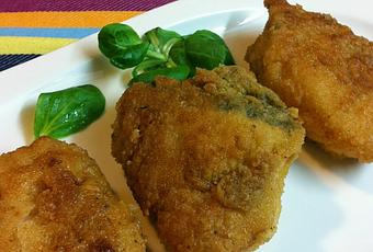 Se saca el adobo, se pone en un plato grande la harina mezclada con el pan rallado, se rebozan los tacos y se fríen en abundante aceite caliente. Se sirven calentitos.