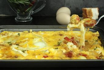 Rehoga la panceta que has cortado en trocitos pequeños, incorpora el pimiento y el puerro picados muy finos. Salpimenta. Bate los huevos e incorpora el queso rallado. En la misma sartén o en una fuente de horno metálica que has untado con mantequilla, añade todos los ingredientes e incorpora el queso en trozos.