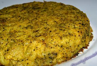 6 patatas medianas cocidas1 brócoli hervidoSal marina50 ml. de bebida vegetalMedia cucharadita de cúrcumaAceite de oliva virgen extraProcedimiento:En una fuente incorporamos las patatas (peladas y troceadas) y el brócoli hervido. Con un chafador lo machacamos bien hasta conseguir un puré denso. Incorporamos la leche vegetal, sal y la cúrcuma, integramos bien todos los ingredientes hasta conseguir un puré espeso y manejable, no debe quedar todo triturado, deben quedar trozos.Poner a calentar en una sartén aceite de oliva, verter la pasta de patata y brócoli y cocinar como si de una tortilla se tratase. Debe dorarse por ambos lados y quedar consistente.