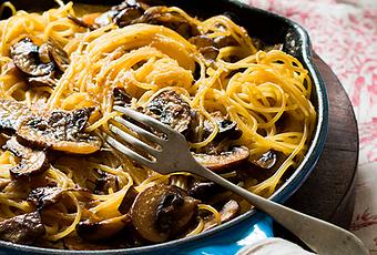 - Batimos bien los huevos en un cuenco grande. Añadimos los espagueti, el sofrito de cebolla y champiñones y unos 50 gr. de queso parmesano. Removemos bien y colocamos en un recipiente apto para horno. Cubrimos con otros 50 gr. de parmesano y horneamos a 150ºC unos 15 min. Sacamos del horno y servimos.