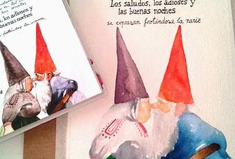 Ya que tenemos al gnomo como presidente del hogar vamos a recordar las buenas costumbres de saludarse y despedirse, el cariño lo cura todo. Acuarelas originales, no hay dos iguales, aunque se intenta.Frotar la nariz