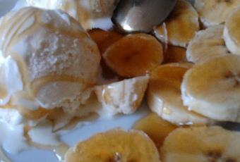NÚMERO DE PERSONAS2TIEMPO DE PREPARACIÓN5 minutosMATERIAL NECESARIOPlatos, cuchillo, cuchara para heladosINGREDIENTES2 plátanosHeladoMiel o siropePREPARACIÓN1. Cortamos los plátanos a rodajas2. Servimos el plátano en el plato acompañado con unas bolas de helado.3. Rociamos todo con un poco de miel o siropeOBSERVACIONESPodemos utilizar cualquier otra fruta e incluso una macedonia.