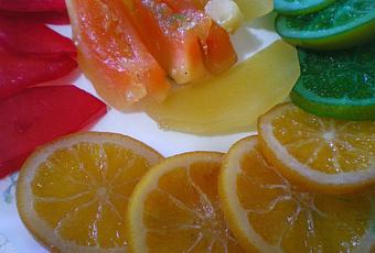 Repetir la operación con 75 g. de azúcar. Seguidamente añadir 2 cucharadas de agua de azahar y dejar reposar durante 4 días.En este punto podemos añadir los colorantes al almíbar para teñir la fruta que deseemos.Éste será el último proceso de reposo y, si se desea, se puede dejar durante más tiempo, hasta dos semanas.