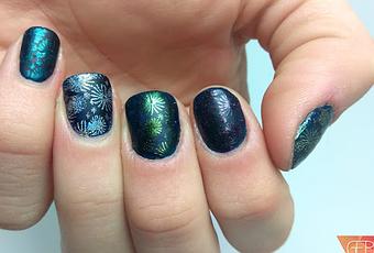 Pensé justo lo que se ve: manicura azul oscuro mate, con los fuegos en brillante. Además, quería que quedara así; sin que se vean demasiado. Me flipa que si no le da la luz, no se ven los fuegos, porque cuando sí le da la luz, se ve la uña toda del color de los fuegos.