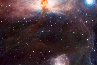 La brillante estrella azulina que se observa a la derecha es una de las tres estrellas brillantes que forman el Cinturón de Orión. La imagen fue creada a partir de imágenes de VISTA tomadas a través de filtros J, H y K en el infrarrojo cercano. La imagen muestra cerca de la mitad del campo completo de VISTA y es de alrededor de 40 x 50 arcominutos de extensión. El tiempo de exposición total fue de 14 minutos.