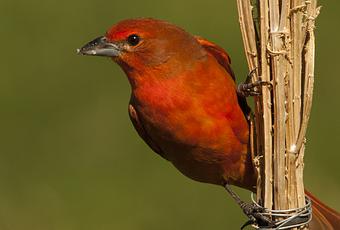 Realmente se disfruta tener a esta belleza tan cerca luciendo tan tranquilamente su notable rojo en el entorno. Solamente en las dos primeras tomas logré acomodarme con respecto al fondo de color verde para lograr que resalte aún mas el color del plumaje del fueguero.