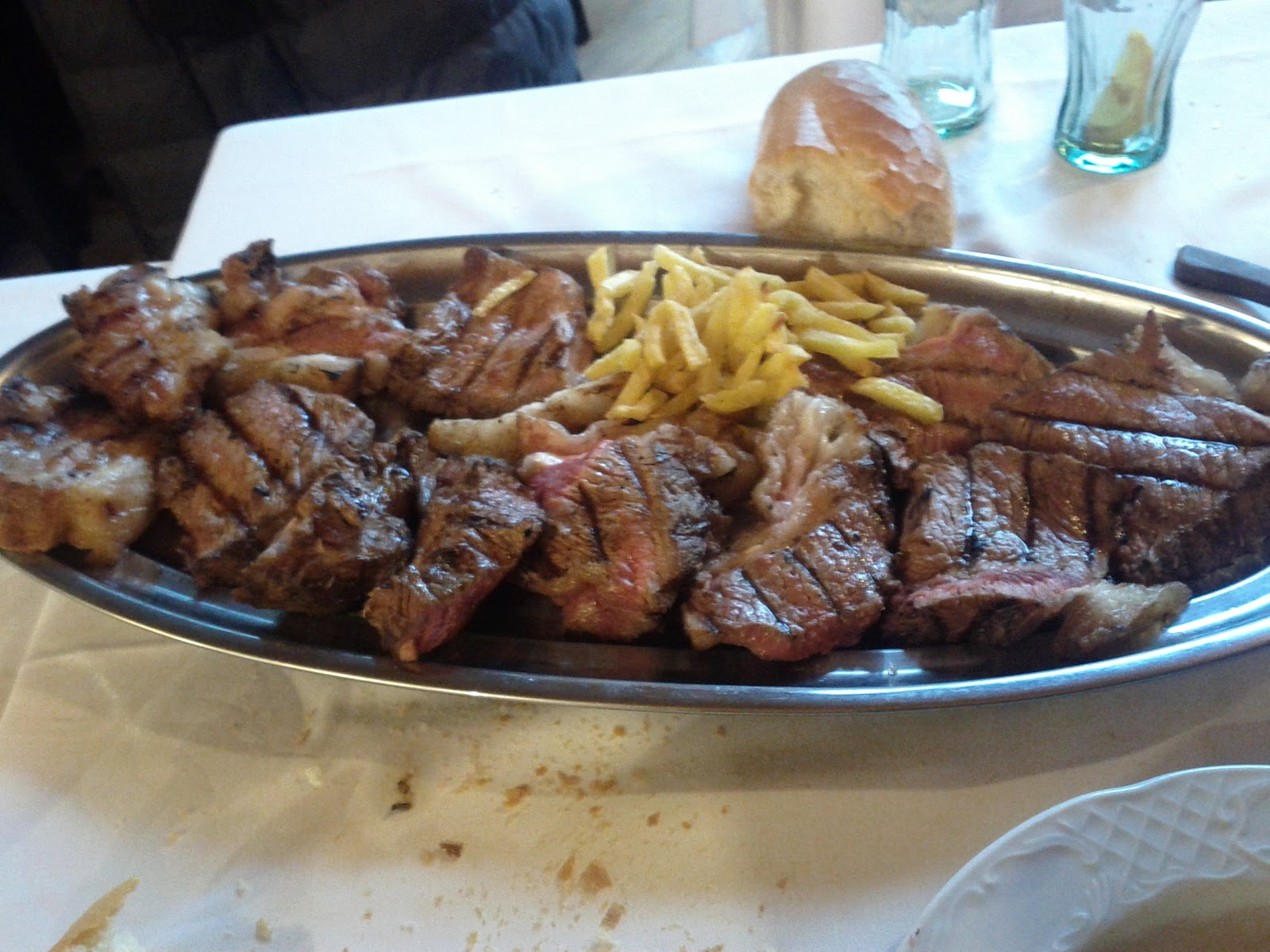 Y así lo hicimos, a pesar de la fama del san jacobo, nos decantamos por el churrasco, ya que no podía ser una barbaridad y la carne a la brasa siempre se digiere mejor. Pues aquí ya ocurrió el primer error: un churrasco para dos se traduce en esto: