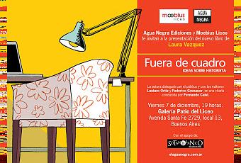 El próximo viernes 7 de diciembre a las 19 horas se realiza la presentación del libro Fuera de cuadro. Ideas sobre historieta, de Laura Vazquez, en la librería Moebius Liceo, Avenida Santa Fe 2729, local 13, Buenos Aires.La autora conversará con el público y con los editores Lautaro Ortiz (Fierro, Historietas Nacionales) y Federico Grunauer (Agua Negra).