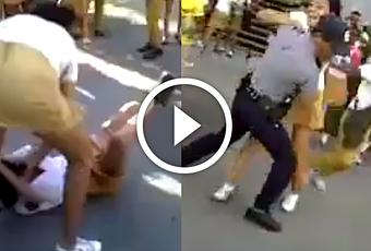 Un oficial de la policía al percatarse de la disputa actúa rápidamente tratando de separar a las dos jóvenes que no dejaban de golpearse.