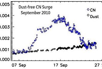"La abundancia de CN en la atmósfera del cometa aumentó en un factor de cinco durante un período de ocho días de septiembre, lo cual es muchísimo", comenta A'Hearn. "Aunque, curiosamente no hubo un aumento o de polvo."