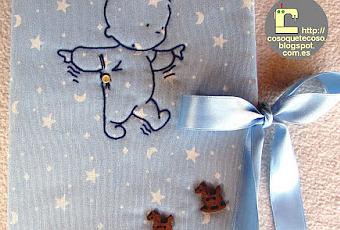 Sigo con los encargos, en este caso, una funda para cartilla sanitaria y, como aún los padres no han decidido el nombre del niño, he bordado un bebé en pijama (el botoncito me encanta), y le he puesto un par de caballitos de madera.