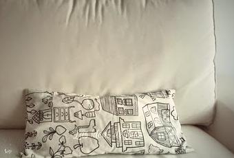 ...pero vamos a mejorarlo un poco mas. Con una tela de Ikea hice una sencilla funda; sólo hay que cortar una pieza de tela de 4 cm mas del ancho y un 10 mas del doble de largo del cojín para el que queramos hacer la funda. Los centimetros de mas es para tener margen para las costuras.