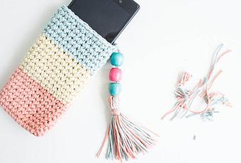 Las medidas de la funda dependerán del tamaño de cada móvil. Montamos un número x de cadenetas y tejemos en circulo varias filas con lana doble, en un borde cambiamos de color y continuamos tejiendo, volvemos a cambiar de color y terminamos de tejer la última parte de la funda. Después hacemos una borla, le colocamos las cuentas de madera y la sujetamos a la funda.