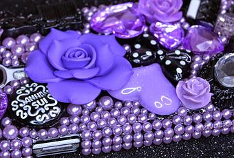 Es una funda de plástico.Sobre esta base están pegados pequeñas réplicas de formas conocidas con la estética de Anna Sui.