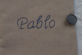 Este mes ha sido el cumpleaños de mi sobrino Pablo.Es una funda para que guarde sus notas, no sé si lo usará para esto o para otra cosa, lo importante es que lo utilice.Por fuera es una loneta de color arena, con su nombre bordado a mano con hilos de la Finca del número 12.Por dentro, para chicos, me decanto por las telas de vichy, que son las que más me gustan.Ya sabéis, con compartimento para las tarjetas de crédito, si alguien se anima a regalársela, seguro que a Pablo le encantaría...