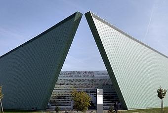 English versión Architectural presence charged with symbolism. The headquarters building of the Eye Bank Foundation of Venice is a design study Emilio Ambasz Associates, located on an area of 2.8 hectares on a plateau of the town of Mestre, close to the new Regional Hospital also designed by Ambasz . The triangular floor building is developed in three levels and has 5,000 m2 of medical facilities including a surgical area for research laboratories, an eye treatment center, administrative offices and an auditorium for 450 people, distributed in its 11,620 m2. The image that defines the headquarters from the road, sample a "mask" consisting of two planes that occupy two sides of the triangle. Forming a virtual vertex at the base with a significant separation of the planes to ground level, each wall rises diagonally placed on the highest point at minimum distance from each other, without making contact, in a symbology rapprochement of to the hands on the most important fresco in the Sistine Chapel, "Creation of Adam", the great work of Michelangelo. The trapezoidal walls that make up two of the sides of the triangle containing the architecture that runs behind, establish a barrier with the route to the building is developed on nature. The "hands" reach 12 meters at its highest point, covered in copper dyed green. Behind the plans, a ziggurat-shaped building opens from the base of the triangle, covered with terraced gardens, resembling an outdoor amphitheater that bursts from the ground and rises content between green walls. The three levels elevated headquarters contain research areas, operating rooms and administrative areas and underground auditorium and educational spaces. The lobby of the auditorium is one level below ground taking two heights, the same level as the sunken court which is located at the base of the triangle. Thus, all local receive natural light and expand to patios or terraces covered with vegetation, which combined with cantilever slabs minimizes the action of heat in warm seasons preventing the entry of sunlight. At the lowest level of the building are parking lots, connected by a corridor to the lobby of the auditorium. The headquarters of the Eye Bank Foundation of Veneto is another of the "myths" of Ambaz, a building that combines symbolism with pragmatism and abstraction with nature. Ambaz's work pursues an idea of architecture is not aggressive to the environment embodied in a language of poetic allusions, which can establish controversies, but is exempt from any demagoguery formal as happens with much of the current architecture.Escrito en: Arquitectura