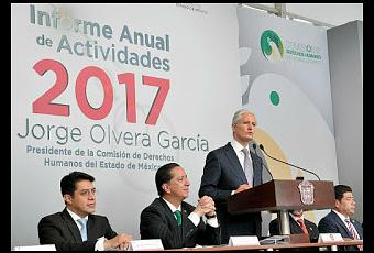 Toluca, Edomex.- Durante el Informe Anual de Actividades 2017 del Presidente de la Comisión de Derechos Humanos del Estado de México, el gobernador Alfredo Del Mazo Maza, dijo que garantizar el respeto de los derechos de las personas, es una prioridad para la administración estatal, ya que al hacerlo, también se otorgan más alternativas de progreso a los sectores menos favorecidos de la ciudadanía.