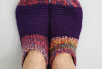 El modelo de la foto, combina dos tipos de lanas: lana morada de un único color y lana multicolor, por eso queda un pie diferente del otro, porque la lana va cambiando de color.