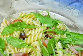 Escurrimos la pasta, la colocamos en una ensaladera, incorporamos la salsa y mezclamos muy bien, por ultimo añadimos la rucula y listo, a emplatar y a comer.