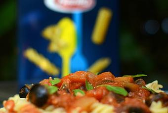Poner en una cacerola un poco de aceite de oliva, los ajos, tomates, las berenjenas, los puerros picados y rehoga un rato, a fuego medio, cuando ya esté listo, agrega el puré de tomate, las aceitunas picadas, déjalo un rato a fuego bajo, por lo menos 25 minutos,añade la sal, las hojas de albahaca. Prueba y rectifica la sal, añade la pimienta negra molida.Hierve los fusilli al dente en agua con sal. Escurre. Sirve los fusilli con la salsa, espolvorea el queso parmesano y unas hojitas de albahaca.