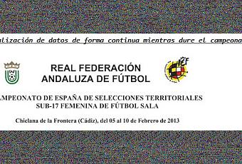 La localidad gaditana de Chicalana acoge como sede única nacional desde el miércoles, 6 de febrero, y hasta el domingo 10 de febrero el Campeonato de España de Selecciones Territoriales Sub-17 Femenína de Fútbol Sala. Nueve selecciones autonómicas compiten en esta cita, de donde saldrá el nuevo campeón de España de esta categoría femenina. Las selecciones participantes son: Rioja, Navarra, Madrid, Murcia, Aragón, Andalucía, Cantabria, Galicia y CataluñaPinchando en el enlace inferior podéis ver todos los horarios así como datos de los equipos participantes que se irán actualizando durante el día de hoy. Durante el Campeonato se irán publicando resultados y resúmenes de los partidos en la medida que sea posible.