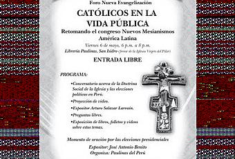 Les alcanzo una invitación al foro Católicos en la Vida Pública, sobre el papel de la doctrina social de la Iglesia y las próximas elecciones presidenciales, con exposición por parte de Arturo Salazar Larraín, proyección de vídeo, conversatorio, exposición de libros y folletos. Dia: 6 de mayo de 6 a 8 pm. Lugar: Libreria Paulinas, Av. Victor A. Belaunde 121-129, San Isidro (frente a la Iglesia Virgen del Pilar).
