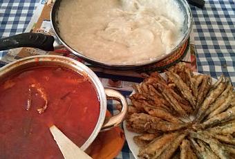 En una sartén con abundante aceite se fríe el boqueron que ya tendremos limpio,se reserva.a continuación en una cacerola se pone el aceite se sofríen troceados los pimientos,los ajos y la cebolla, cuando todo esta bien sofrito se retira del fuego y se añade el pimentón se mezcla todo y se le pone el tomate , la sal y el laurel se pone nuevamente en el fuego unos minutos para que el tomate se sofríaañadimos el agua , los boquerones que teníamos reservado y dejamos hervir.