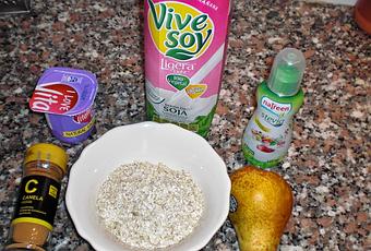 Ingredientes:- 60 gramos de avena.- 150 ml de leche.- Un yogur.- Canela en polvo u otro condimento que os guste.- Una pieza de fruta (yo usé pera y quedó genial, pero seguro que con manzana, plátano, fresas, etc. queda de muerte igual).- Para endulzar podéis poner azúcar, miel, stevia... yo la tengo allí pero al final no la usé porque el yogur y la canela ya endulzan suficiente.